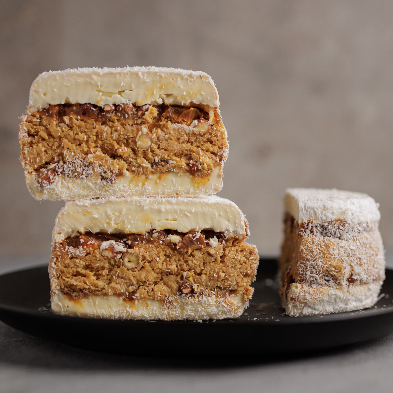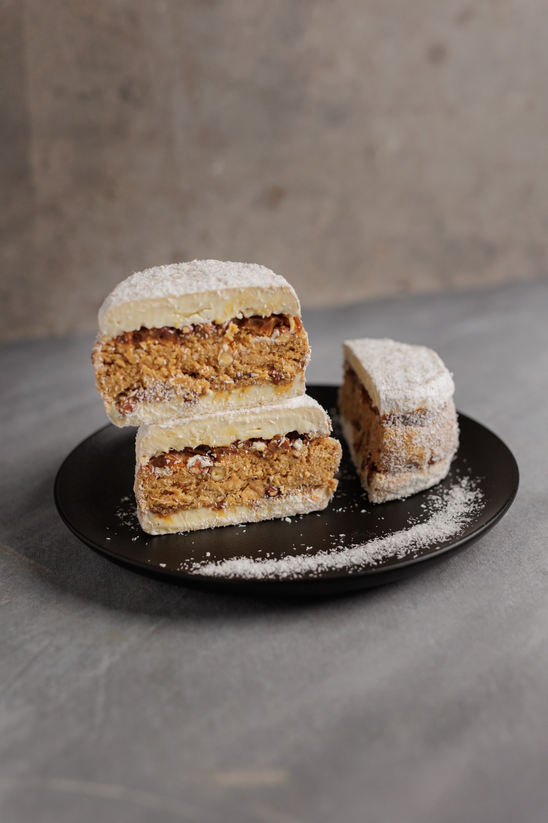 Camembert intervenido con coco, con un corazón cremoso de mascarpone, coco y un sutil toque de dulce de leche.