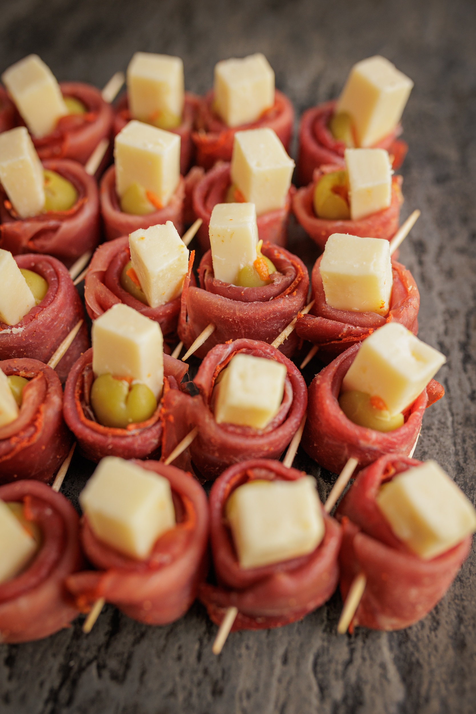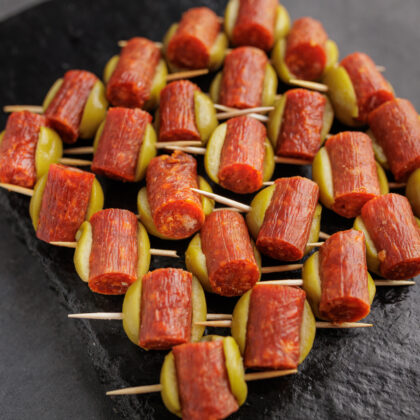 Pinchos de culatello, reserva raclette y aceituna rellenas con morrón