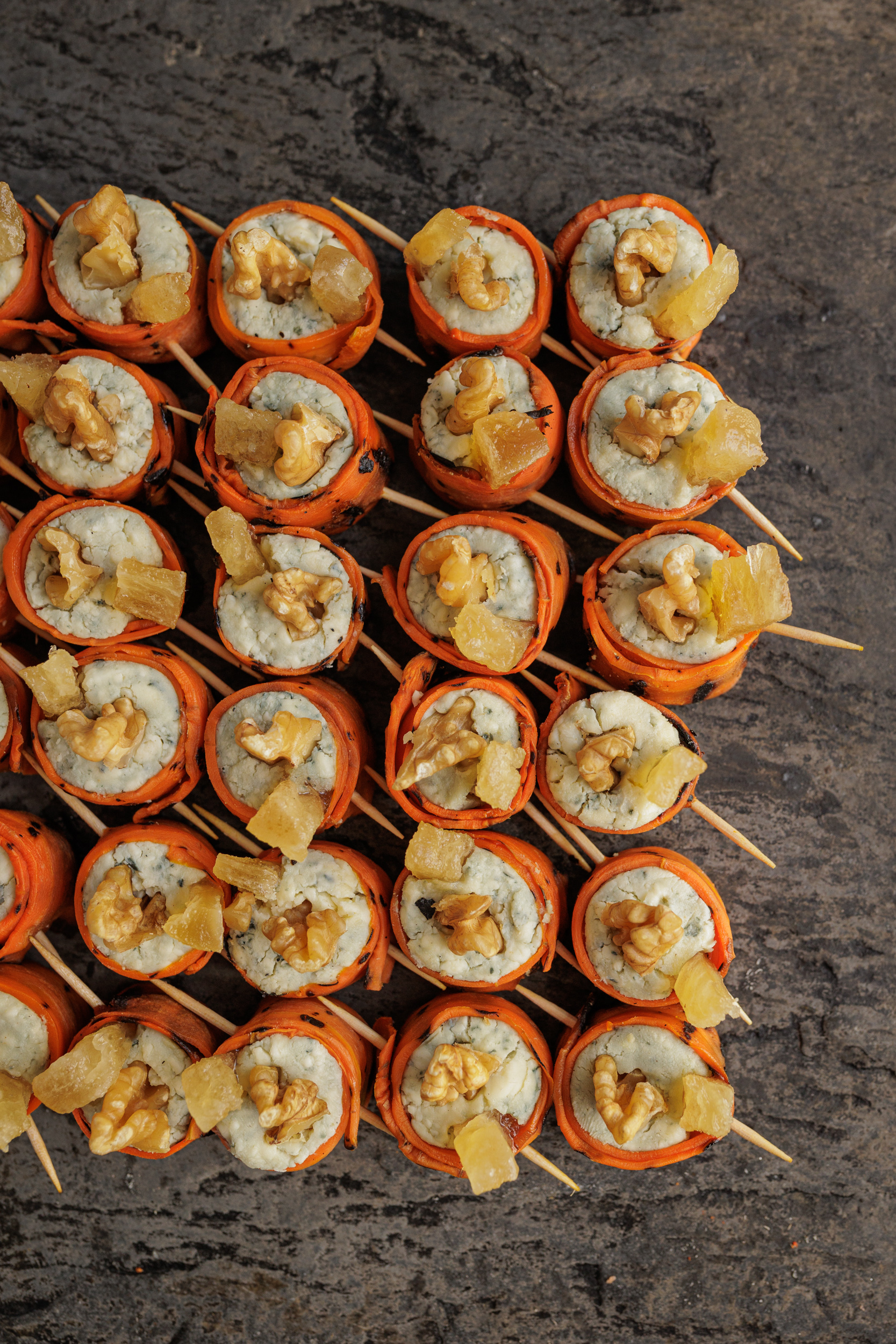 Pincho de Zanahoria Grillada, Queso Azul, Peras y Nueces