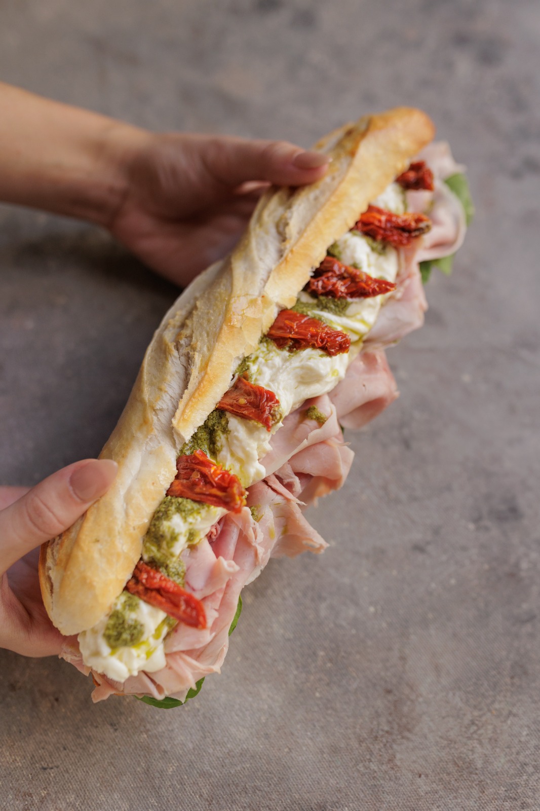 Sandwich de jamón cocido braseado y horneado con straciatella, rucula, tomates secos y cremita con cibulette