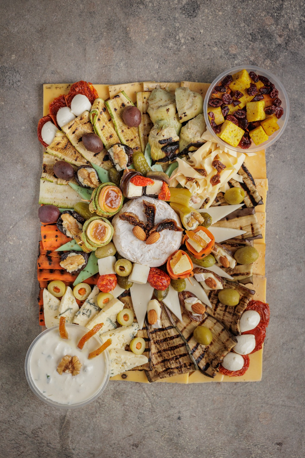Combinamos una variedad de quesos tradicionales suaves, acompañados de vegetales, aceitunas y frutos secos. Junto a una variedad de pinchos vegetarianos. Completamos con Dips untables. Los quesos: Gouda, Ahumado, Con hierbas, Gruyere, Raclette, Atuel, Fontina, De cabra, Roquefort, Los Vegetales y frutas: Zucchini grillado, Alcaucil, Alcaucil grillado, Ajos confitados, Berenjena escabechada, Berenjena grillada, Tomates secos